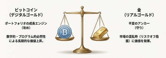 そこで、発行上限があり希少性が高い「ビットコイン(成長エンジン)」と、歴史的な価値保存手段であり市場混乱時に強さを発揮する「金(安定のアンカー)」という、性質の異なる2つの「ゴールド」を組み合わせることで、インフレ耐性を高めつつ、リスクを抑制した資産成長を目指します。