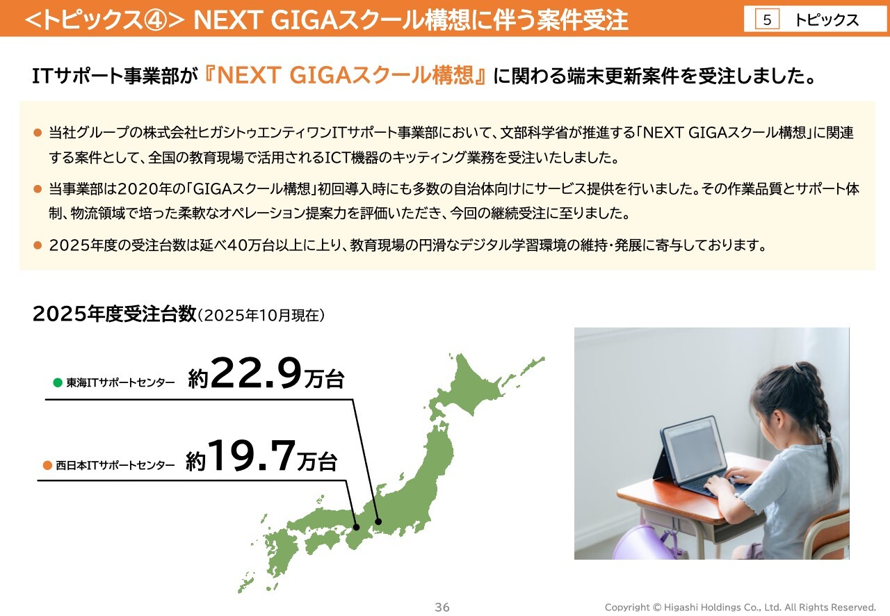 児島:ITサポート事業部の受注案件についてご紹介します。当社グループの株式会社ヒガシトゥエンティワンITサポート事業部では、文部科学省が推進する「NEXT GIGAスクール構想」に関連する端末更新案件を受注しています。