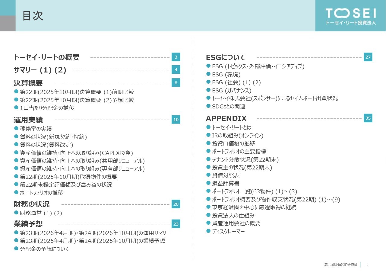 大河内幸貴氏:こんにちは。トーセイ・アセット・アドバイザーズ株式会社REIT運用本部長兼投資運用部長の大河内です。本日はお忙しい中、トーセイ・リート投資法人の第22期決算説明会にご参加いただき、誠にありがとうございます。