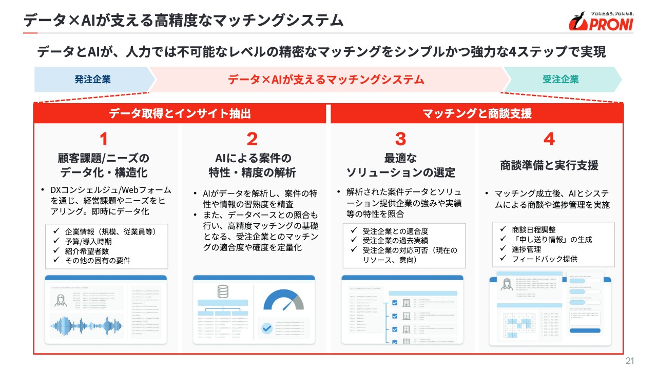 また、どの企業も営業の商談記録は残していると思いますが、当社のマッチングシステムは、オンライン商談が終わると自動的に内容をテキスト化し、AIが案件のマッチングを行う仕組みです。これにより「DXコンシェルジュ」は人とのコミュニケーションに集中できるようになり、生産性がかなり上がっています。1日に対応できる商談数も増えていますし、人がテキストを打つことによるミスや恣意性もなくなってきています。今後も継続的に生産性は上がっていくと考えています。