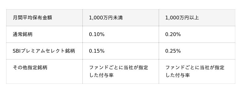 ・付与対象は、当社取扱いの国内公募株式投資信託のみとなり、MMF、中国F、MRF、外貨建MMF、ETF、REIT、外国籍投資信託、SBIラップ専用ファンドは対象外となります。