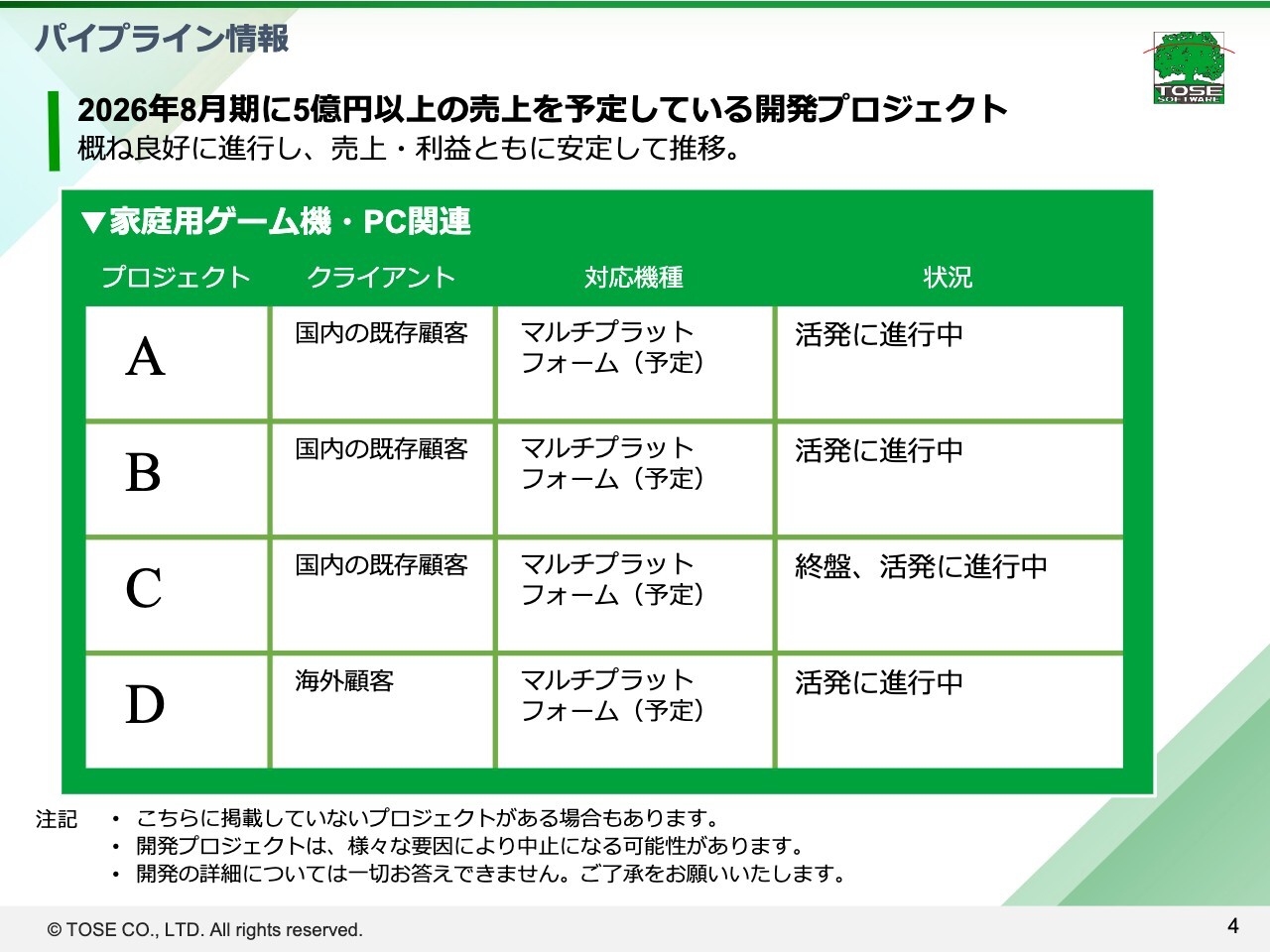 ゲーム事業において、2026年8月期通期で5億円以上の売上計上を予定している開発プロジェクトはご覧のとおりです。いずれも概ね良好に進⾏しており、売上高・利益ともに安定して推移しています。