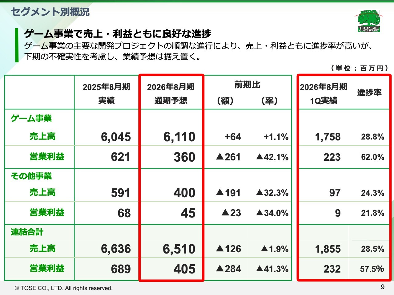ゲーム事業については、第1四半期の売上高・利益は、ともに通期業績予想に対する進捗率は⾼いものの、今後立ち上げ予定の開発プロジェクトに関する不確実性を考慮し、現時点では前回発表の業績予想を据え置いています。