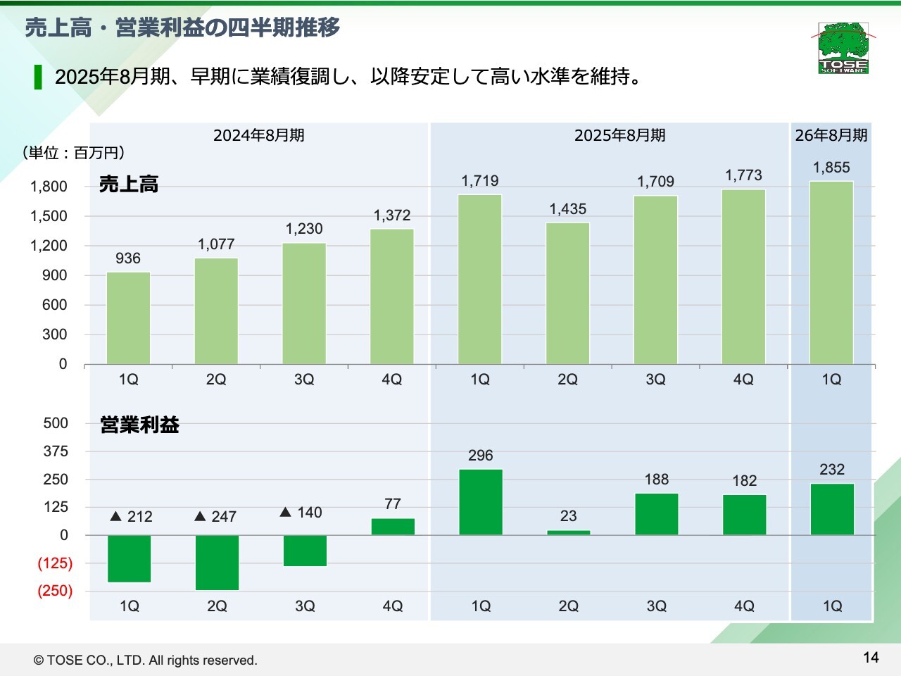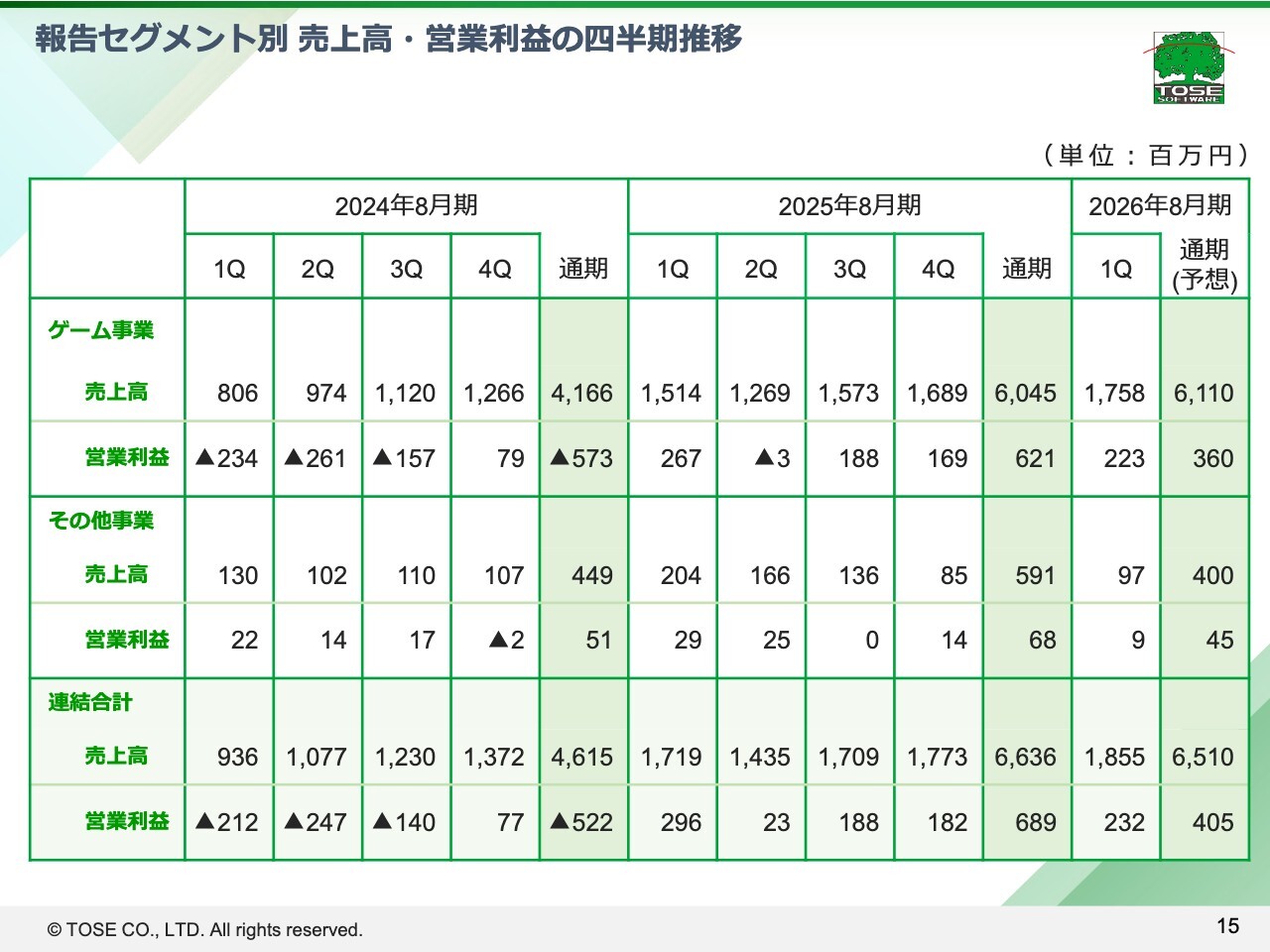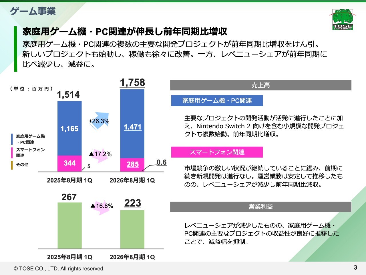 また、「Nintendo Switch 2」向けも含め小規模な開発プロジェクトも複数始動しており、稼働も徐々に改善し、主軸事業であるゲーム開発は前期のV字回復に引き続き堅調に推移しています。結果、売上高は前年同期に比べて26.3パーセント増加し、14億7,100万円となりました。