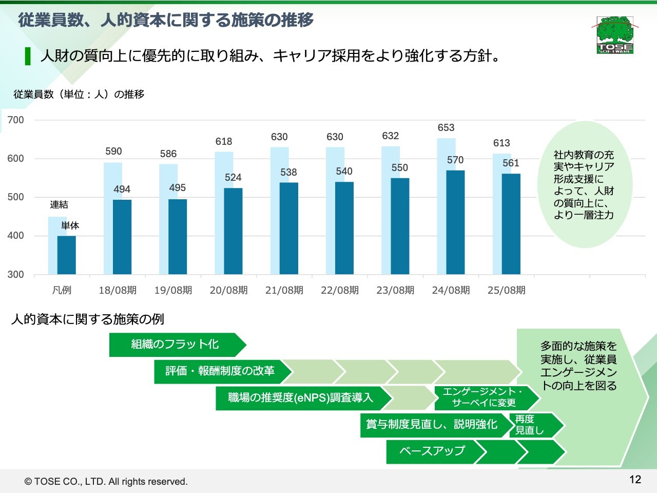 2025年8月期決算説明資料より、従業員数、人的資本に関する施策の推移です。