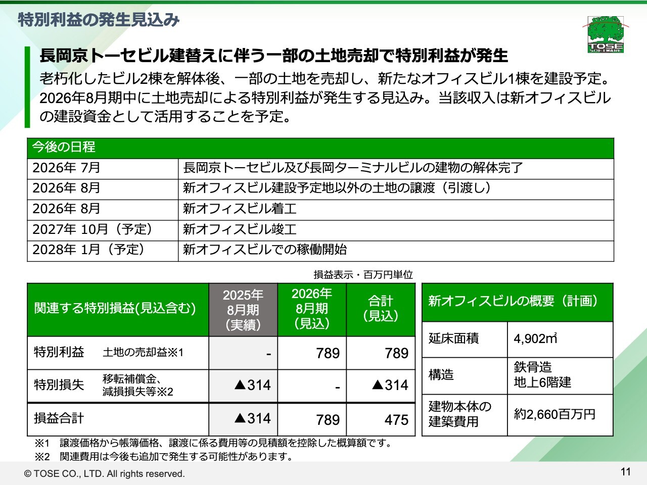 A:2026年8月期においては、長岡京トーセビルの建替えに伴い一部の土地を売却することにより、約7億8,900万円の特別利益の発生を見込んでいます。なお、この特別利益は、土地の売却価格から帳簿価格、譲渡に係る費⽤等の⾒積額を控除した概算額です。この土地の売却によって得られるキャッシュについては、新オフィスビルの建設資金として活用する予定です。