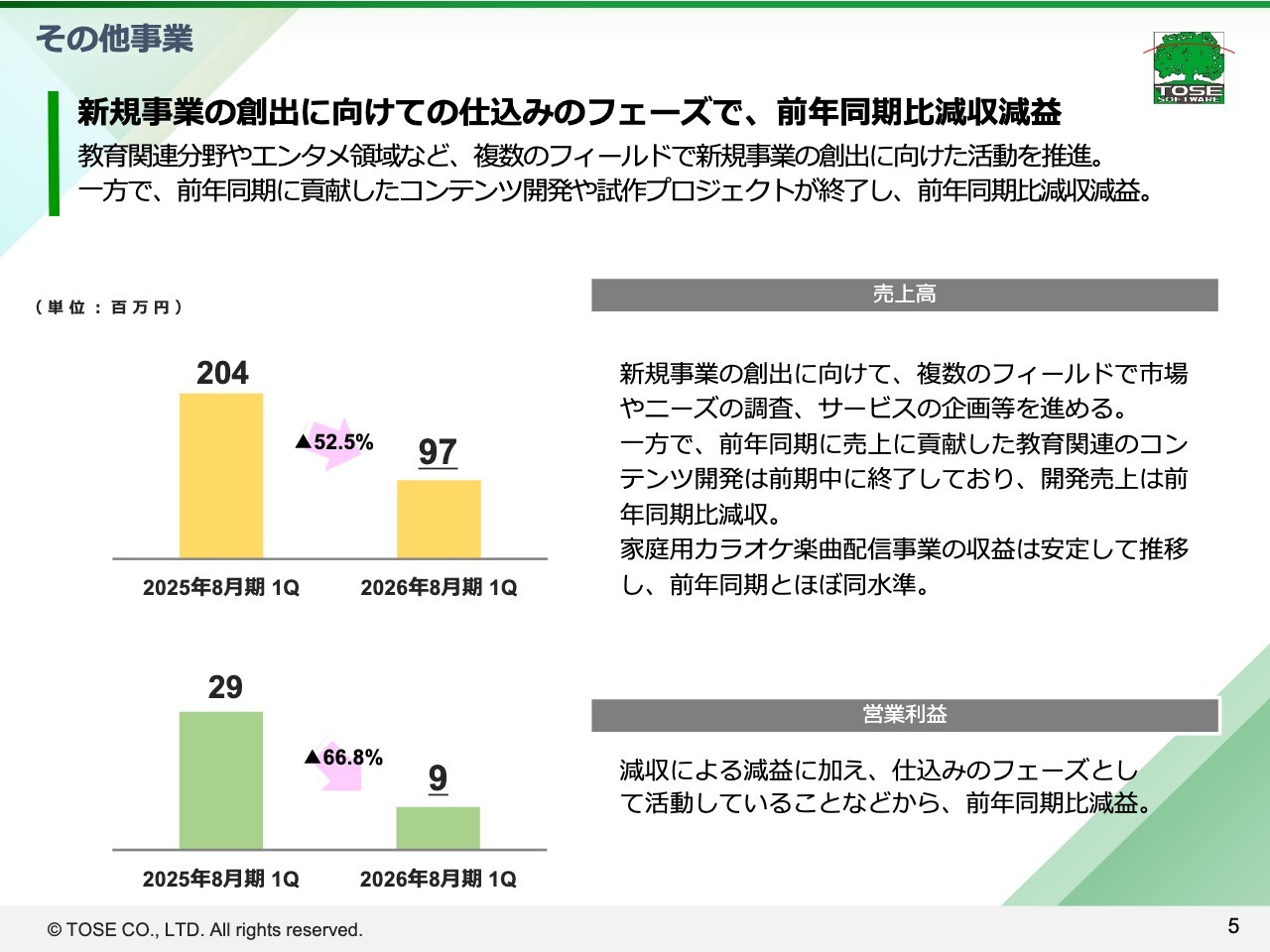 結果、その他事業の売上高は9,700万円と前年同期に比べ52.5パーセント減少し、セグメント営業利益は900万円と前年同期に比べ66.8パーセント減少しました。