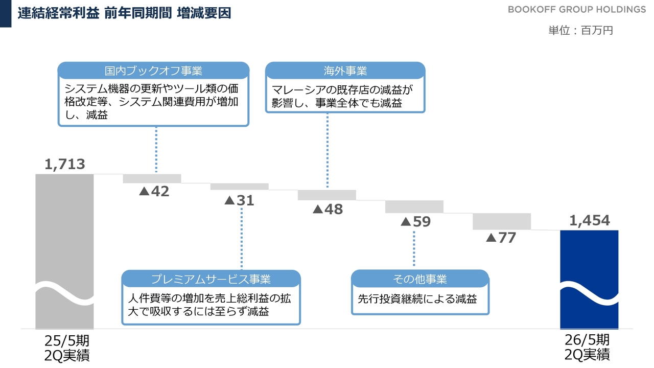 国内ブックオフ事業は、システム投資を積極的に進める中で、機器類の価格高騰が影響しています。プレミアムサービス事業は、人員体制の拡充を進める中で仕入の伸びが十分ではなく、売上総利益を伸ばし切れなかったことが影響しています。