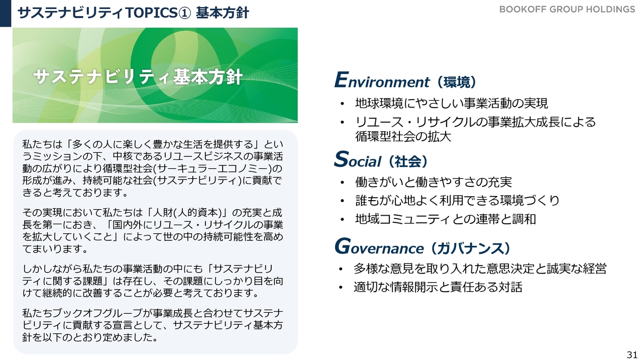環境、社会、ガバナンスのそれぞれにおいて、私たちのリユースビジネスが環境や社会に貢献するだけでなく、運営においてもESGを意識し、誠実に対応しながら投資家の方々と確実にコミュニケーションを取れる環境の整備を進めています。