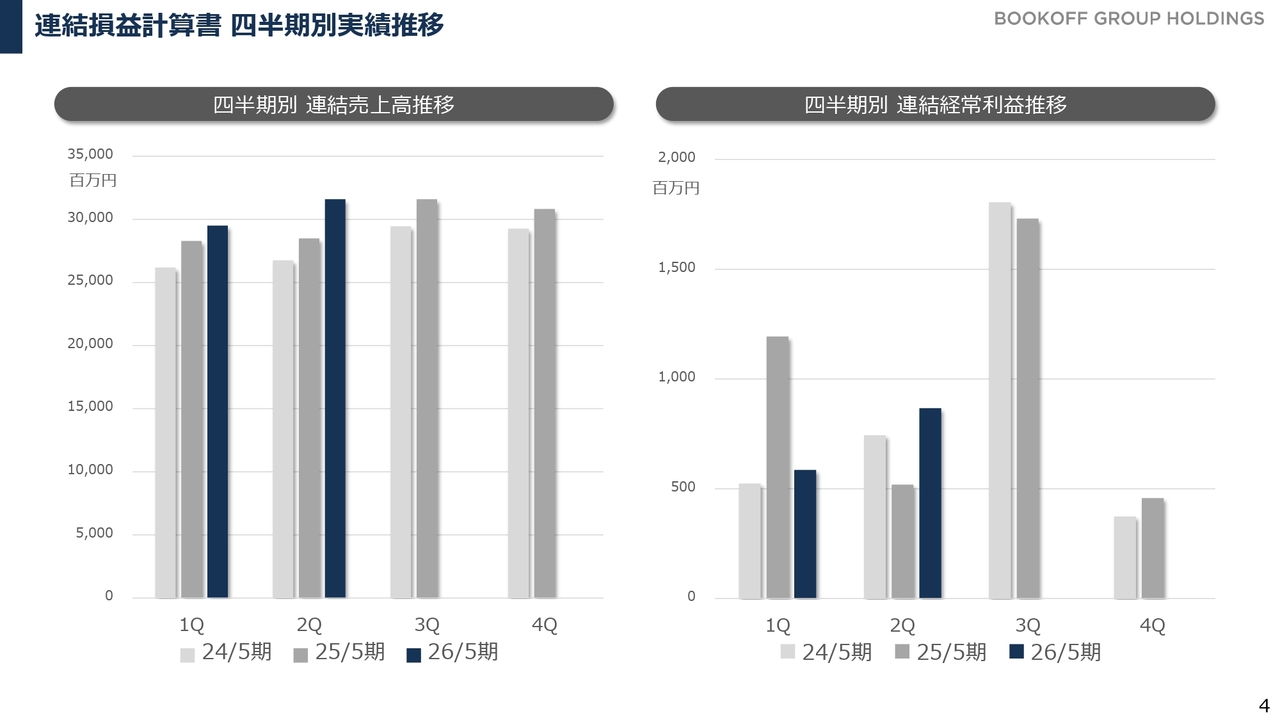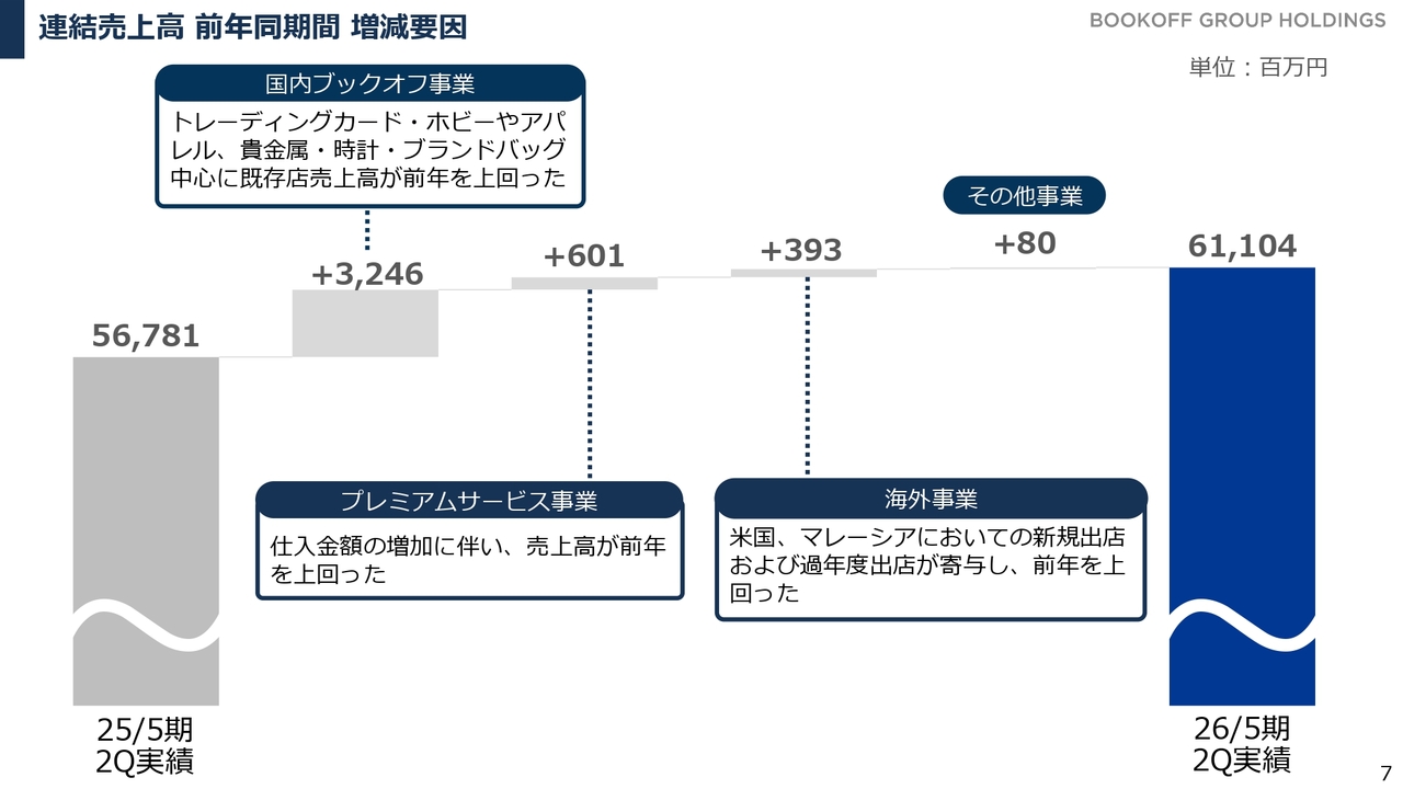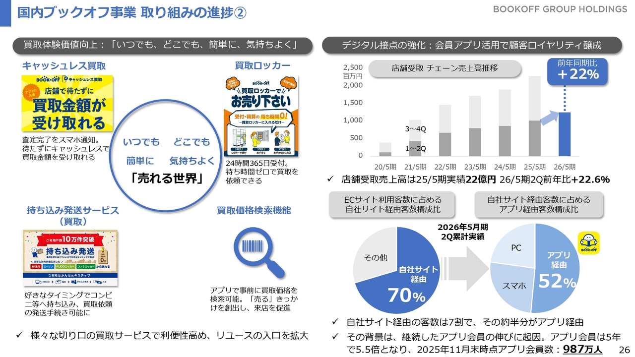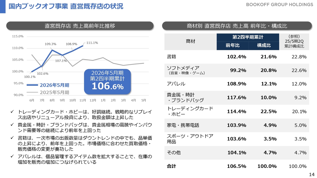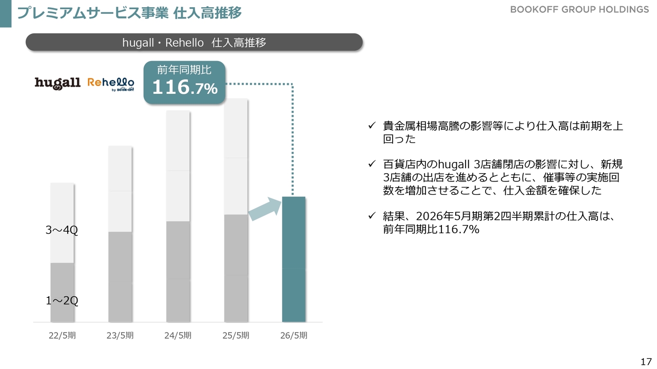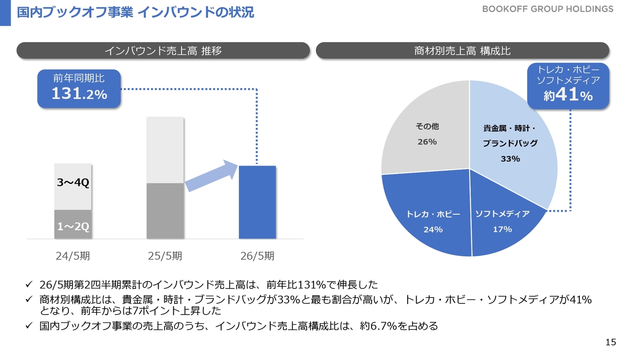 また、先ほど少し触れた貴金属相場の影響により、ブランドバッグやブランド品の買取が増加し、それに伴って売上が増えている状況です。貴金属以外にも国内ブックオフ事業における年末の買取が非常に好調に推移しており、このような動きが下期の売上に寄与すると見込んでいます。