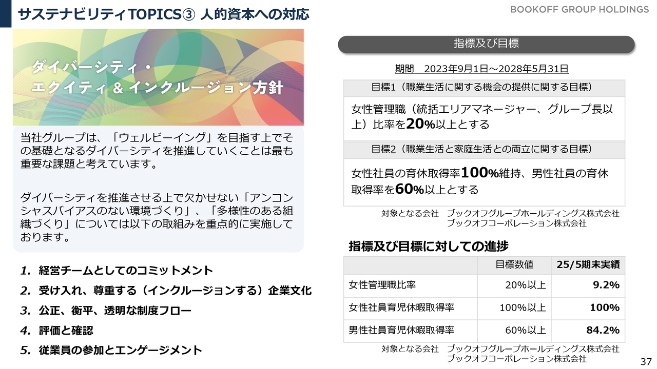 ダイバーシティの観点からは、女性管理職比率の向上や育休取得の促進を目標に掲げ、さまざまな取り組みを進めています。道半ばではありますが、引き続き目標達成に向けて進めていきたいと考えています。