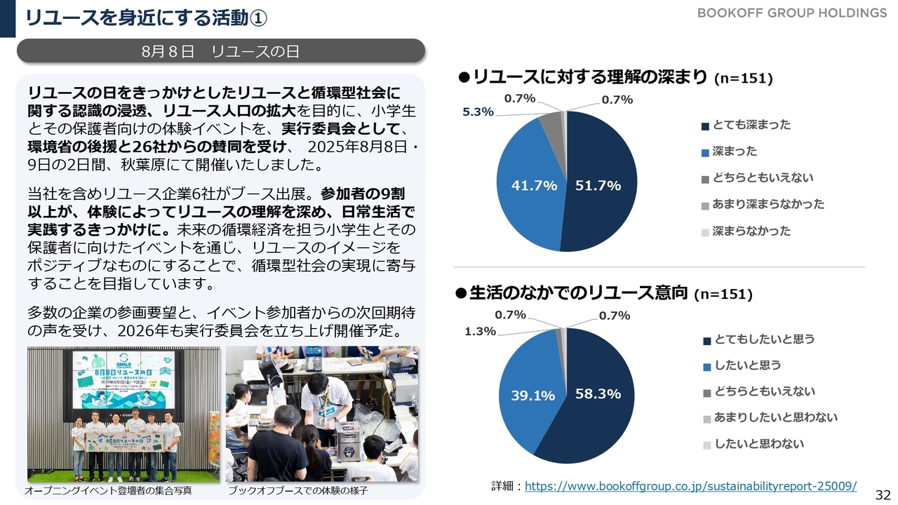 結果として、物を売るリユースだけでなく、捨てずに物を回収するリユースにもご参加いただく取り組みを通じて、リユースの裾野を広げていきたいと考えています。