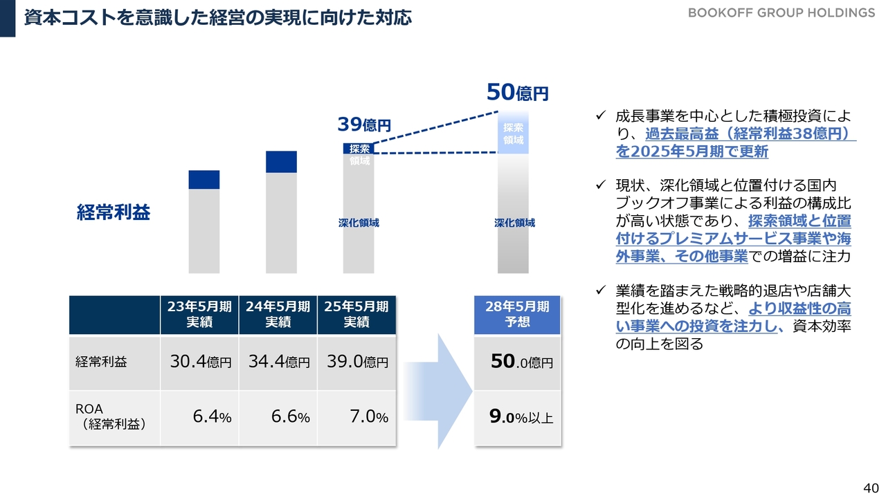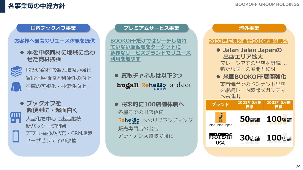 国内ブックオフ事業が安定した収益を確保している中で、探索領域であるプレミアムサービス事業、海外事業、その他事業の領域で利益を上乗せする戦略です。