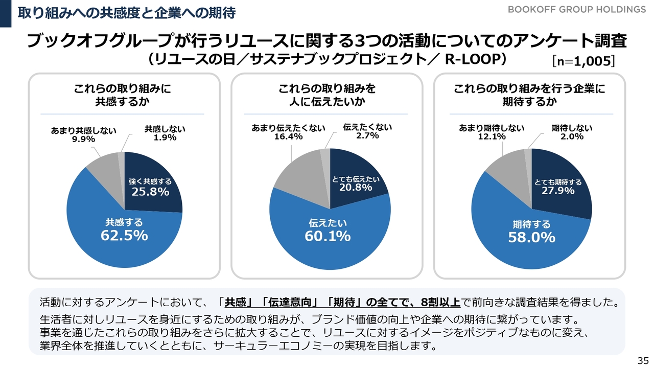 ブックオフグループが行うリユースに関する3つの活動についてのアンケート調査では、これらの取り組みに対して、実に8割以上の方々から共感する、広めたい、あるいは期待するといった回答をいただいています。