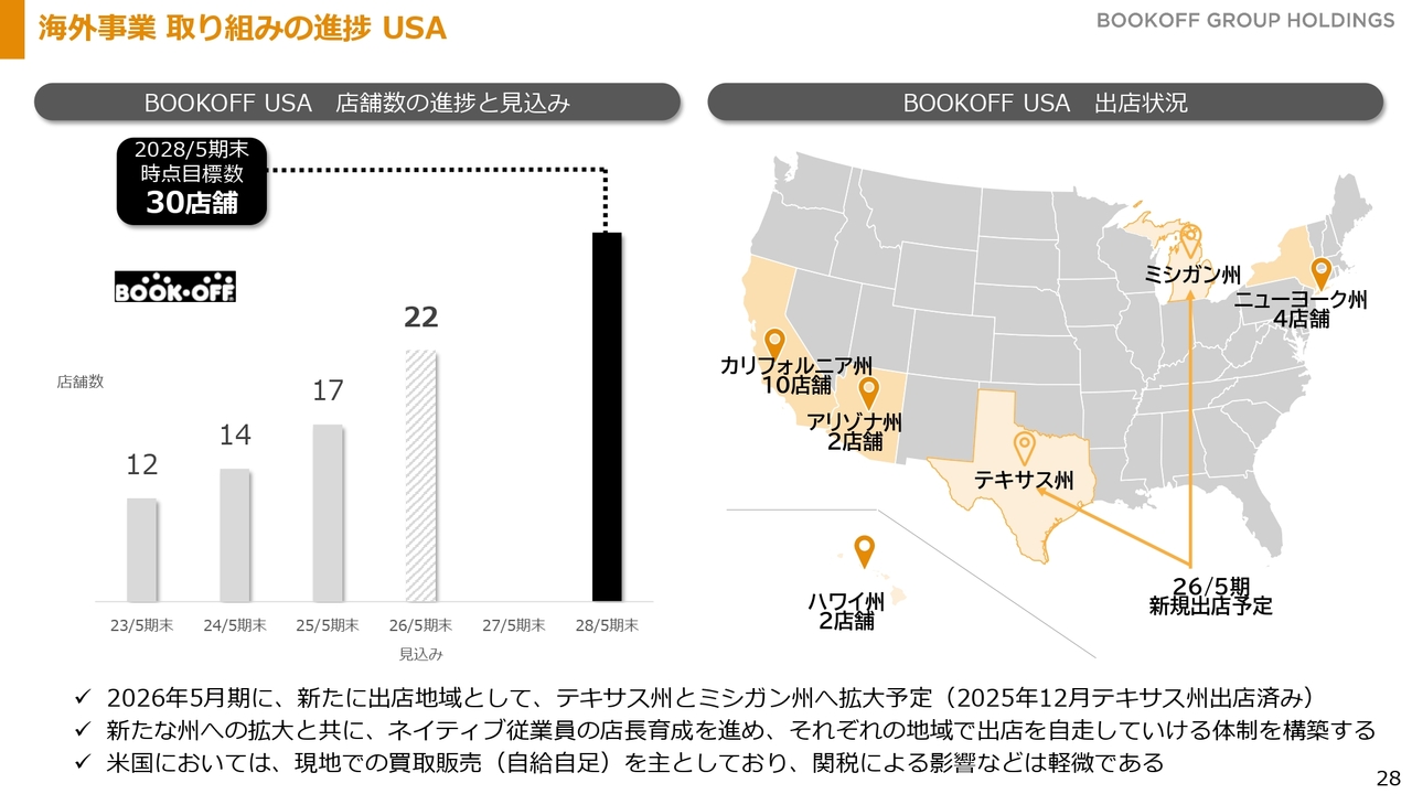 海外事業の取り組みです。アメリカでは、当座の目標である100店舗構想の前段階として、中期経営方針では2028年5月期末までに30店舗を目指すロードマップを掲げています。