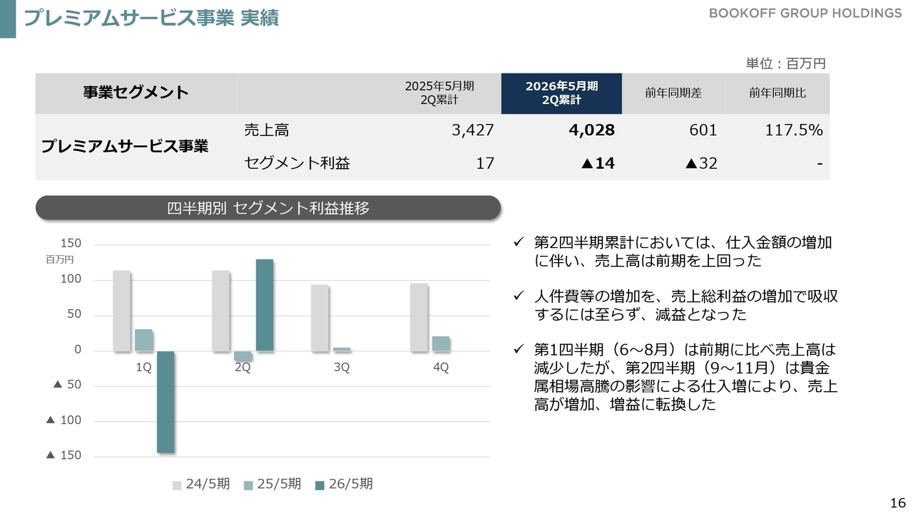 プレミアムサービス事業の業績結果は先ほどご説明したとおりです。第1四半期および第2四半期において、利益の水準が大きく反転しています。