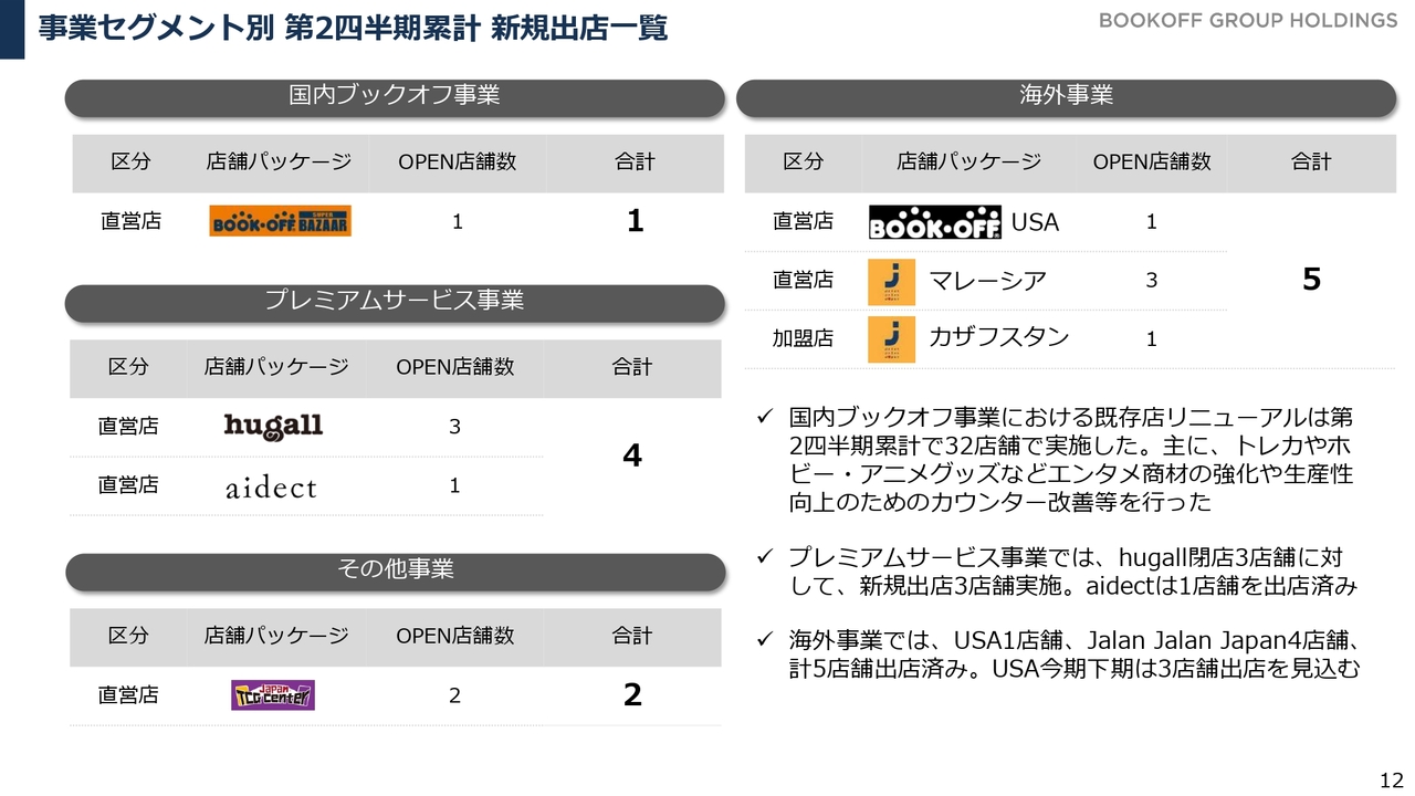 当上期の累計実績です。国内外で12店舗の出店を実施しています。この後、セグメントごとの詳細をご説明します。