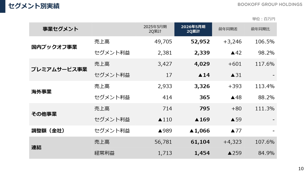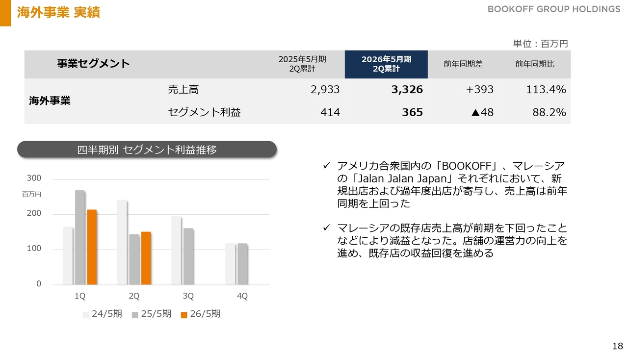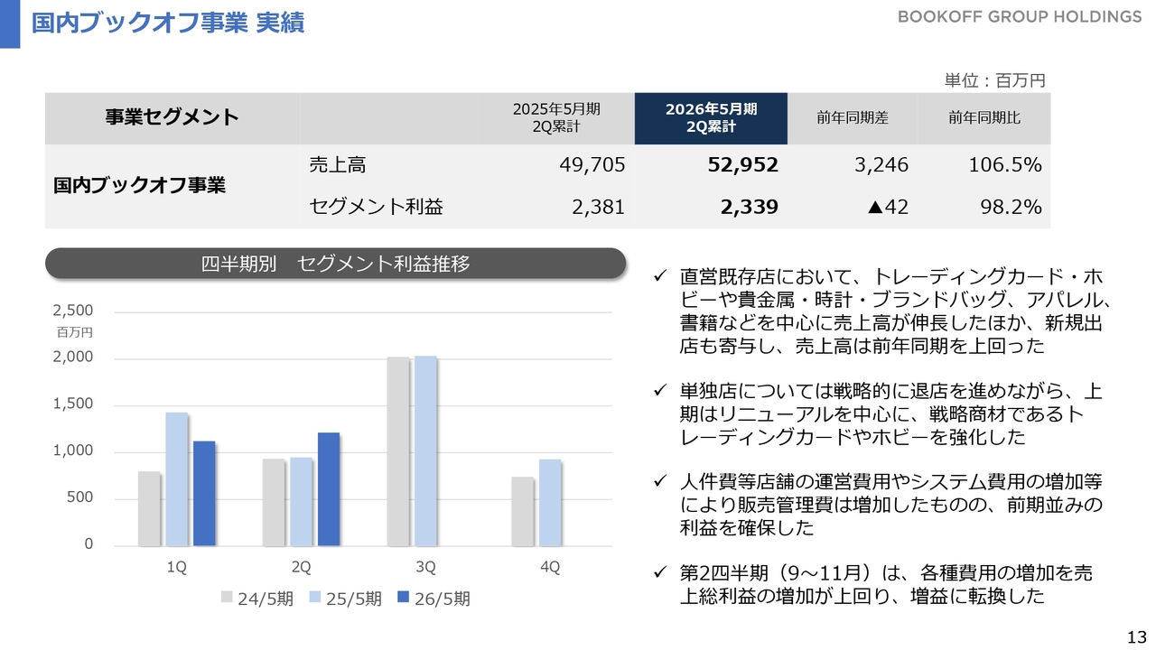 国内ブックオフ事業です。業績に関しては先ほどご説明したとおりです。スライド下段のグラフは、第1四半期および第2四半期のセグメント利益の推移を示しています。