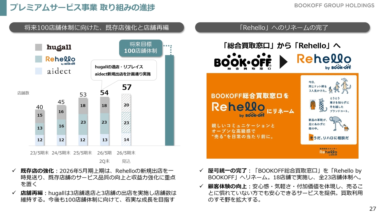 また、「BOOKOFF総合買取窓口」では都内および山手線圏内において富裕層向けに買取サービスを展開していましたが、今後はファッション商材の買取をさらに強化することを目指し、「Rehello」へのリネームを進めています。
