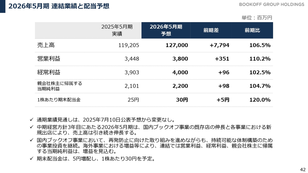 最後に2026年5月期の連結業績および配当予想についてご説明します。