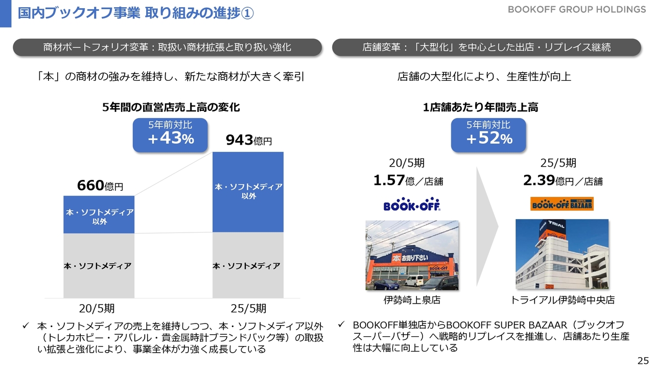 具体的な進捗についてご説明します。こちらのスライドは、国内ブックオフ事業における商材および店舗のトレンドです。