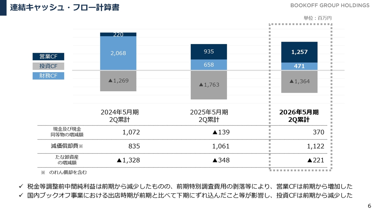 キャッシュ・フローでは、昨年発生した不正事案に関する特別調査費用の剥落に伴い、営業キャッシュ・フローが増加した点が大きなポイントです。引き続き、営業キャッシュ・フローの範囲内を基本に、積極的に投資を進めています。