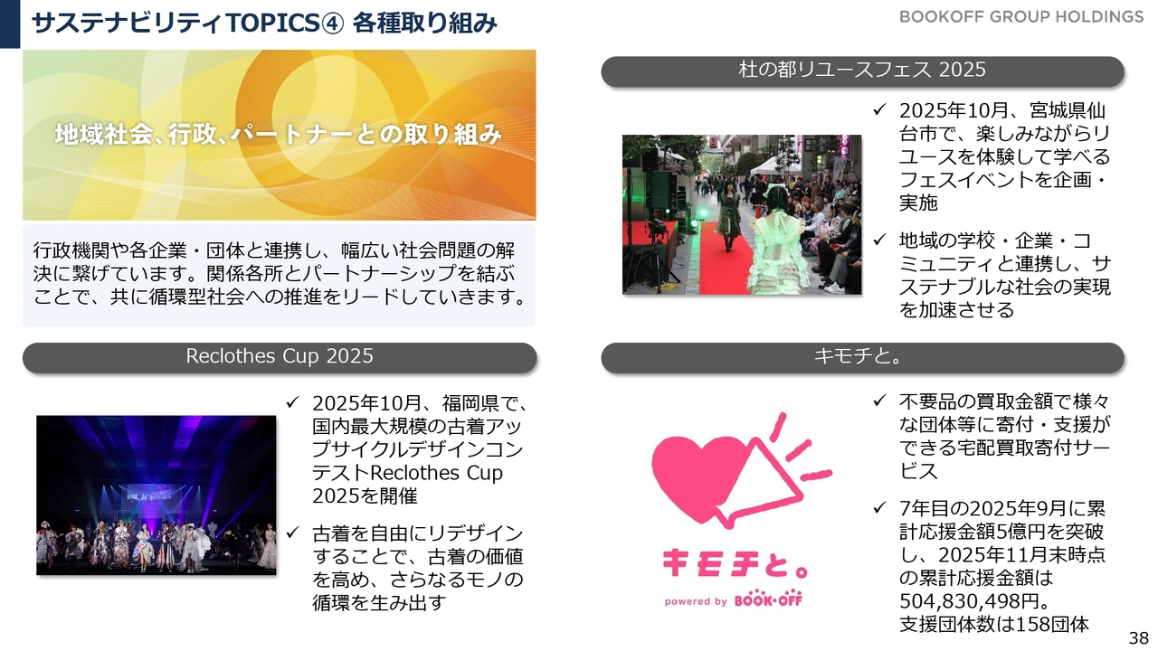 他にも、リユースを基軸とした地域との連携や、人と人とをつなぐ取り組みとして、「Reclothes Cup」「杜の都リユースフェス」などを通じたファッションリユースの推進を行っています。