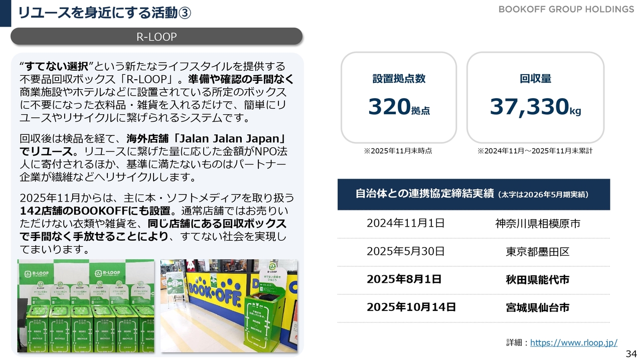 「R-LOOP」に使わなくなった洋服、服飾雑貨、食器などの雑貨類を入れていただき、当社が回収・選別を行って、リユース可能なものは海外で販売することで活かしていく取り組みです。2025年11月末時点で設置拠点数は320拠点、1年間での回収量は約37トンとなっています。