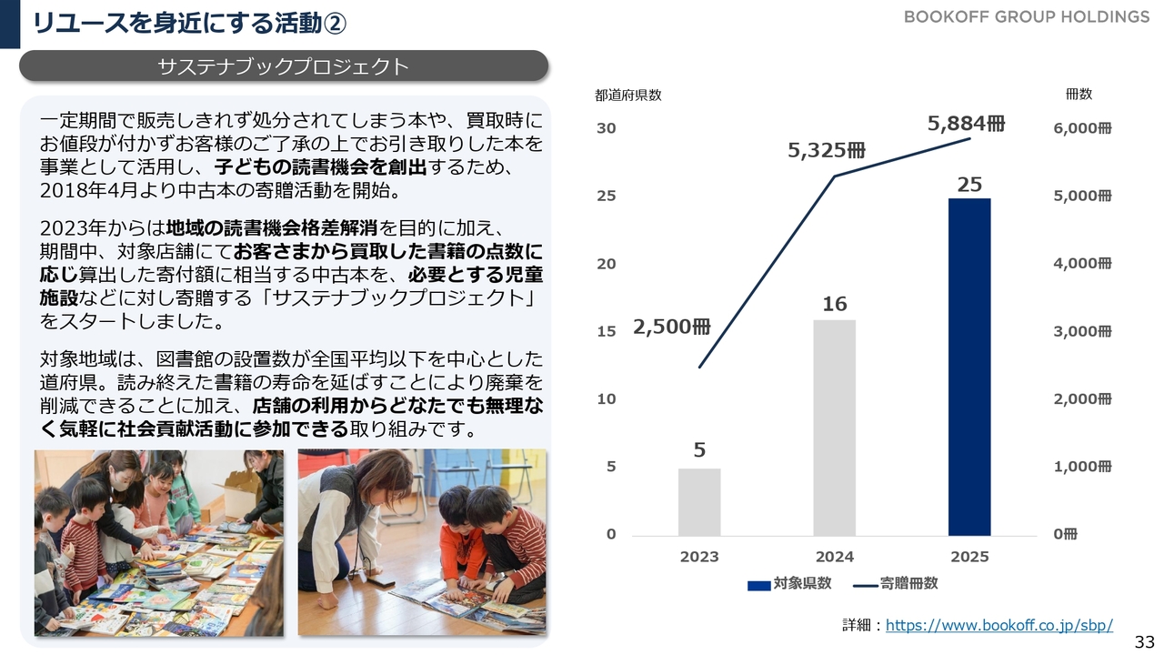 私たちが本を取り扱う活動に着目した「サステナブックプロジェクト」は、読書の機会を十分に持てない子どもたちに本を届けることを目的としたプロジェクトです。一定期間内の買取金額や点数に応じて書籍を寄贈し、子どもの読書機会の創出を図る内容となっています。