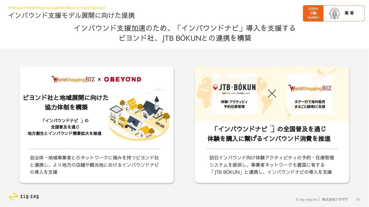 さらに、インバウンド支援モデルの展開を強化するために、「旅ナカ」の事業所とのネットワークに強みを持つビヨンド社と、JTB社の「JTB BÓKUN」との連携を構築しました。これにより、「インバウンドナビ」の導入を推進していきます。