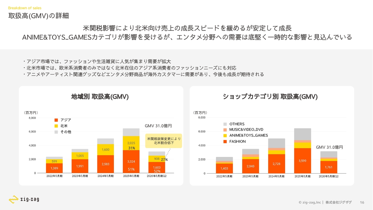 地域別およびショップカテゴリ別の取扱高(GMV)です。アメリカの関税政策の変更により北米向け売上が減速しましたが、アジアでは成長が見られます。
