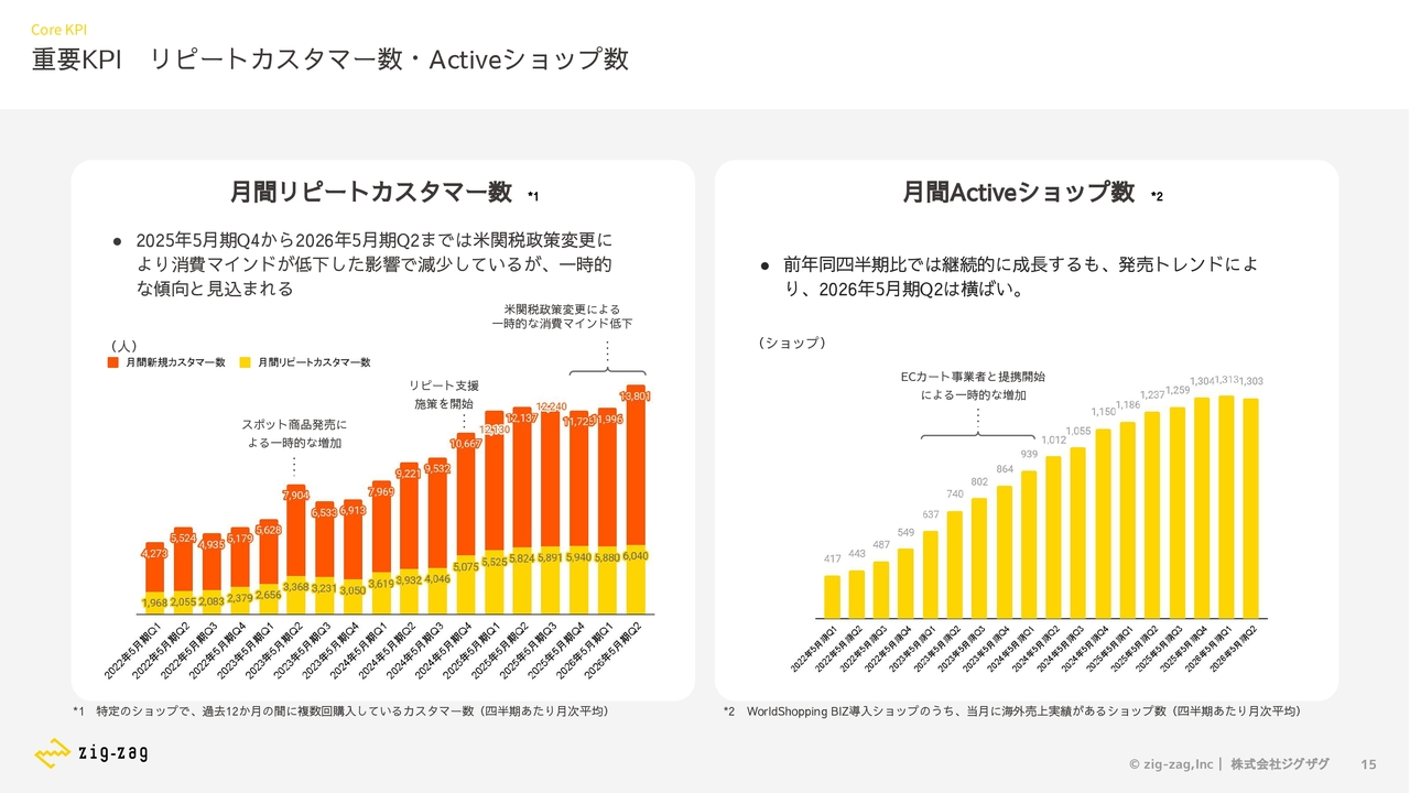 KPIの推移です。月間リピートカスタマー数、月間Activeショップ数ともに、前期の第4四半期から当期の第2四半期にかけてアメリカの関税政策の影響が見られるものの、これは一時的な傾向と見込んでいます。