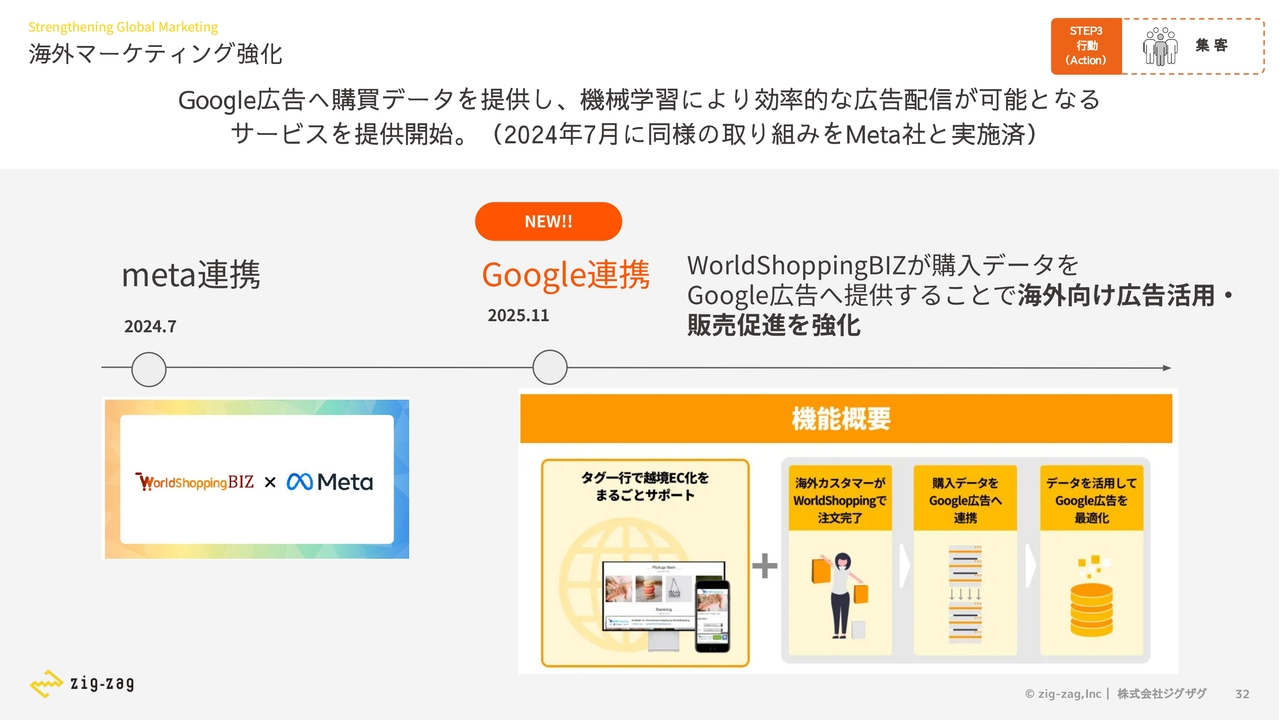 集客機能の拡充としてのGoogle連携についてです。これまで、ショップがGoogle広告を用いて海外マーケティングを行う際に、コンバージョンデータを広告に活用できないという課題がありました。今回の取り組みにより、Google広告の最適化が可能となりました。