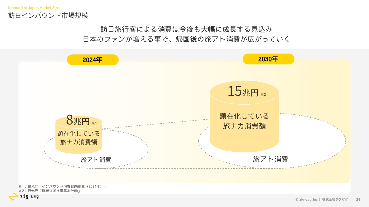スライドは、私たちが考える訪日インバウンド市場の規模を示したものです。まず、顕在化している「旅ナカ」消費の市場規模は8兆円で、2030年には15兆円に成長すると見込まれています。