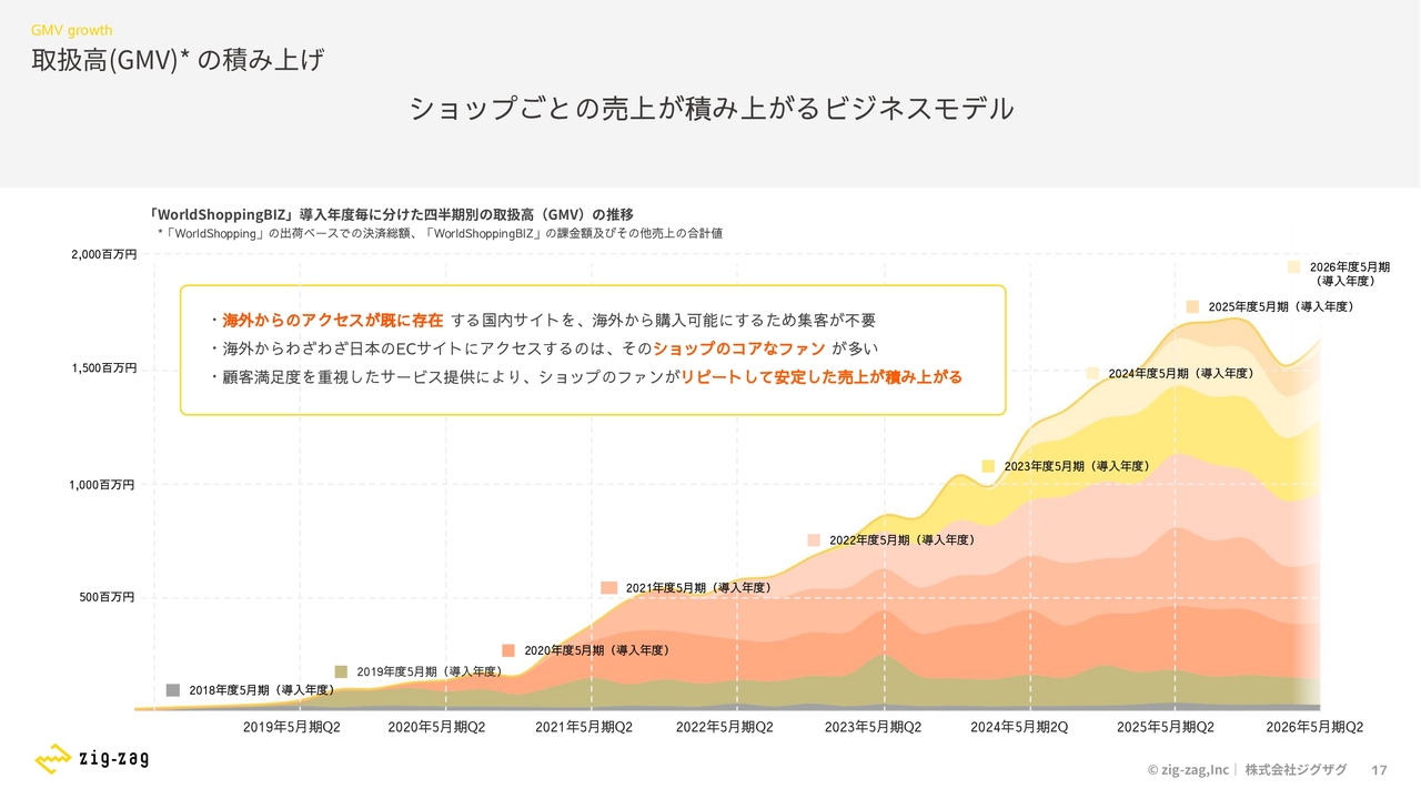 ECショップにとって手間がかからず安価に利用できることから、ショップ数が継続して増加しています。ショップにはすでに海外からのアクセスがあるため、そこから売上高が積み上がっていきます。