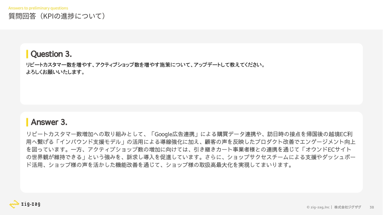 一方、Activeショップ数の増加に向けては、引き続きECカート事業者との連携を通じて「自社ECサイトの世界観が維持できる」という強みを訴求し、導入を促進しています。