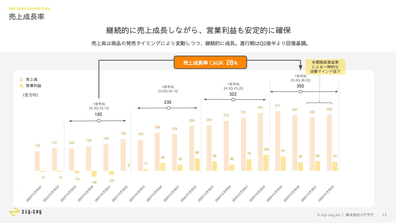 営業利益が前期より減少している理由は、売上の減少に加え、人件費をはじめとした成長投資を継続しているためです。計画上では、第2四半期半ばまでアメリカの関税政策の変更による一時的な売上減速を織り込んでおり、おおむねその見込みどおりの進捗となっています。