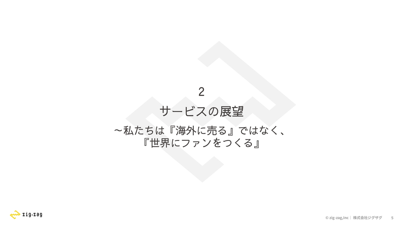 サービスの展望です。当社は単にモノを「海外に売る」のではなく、「世界にファンをつくる」ことを目指しています。