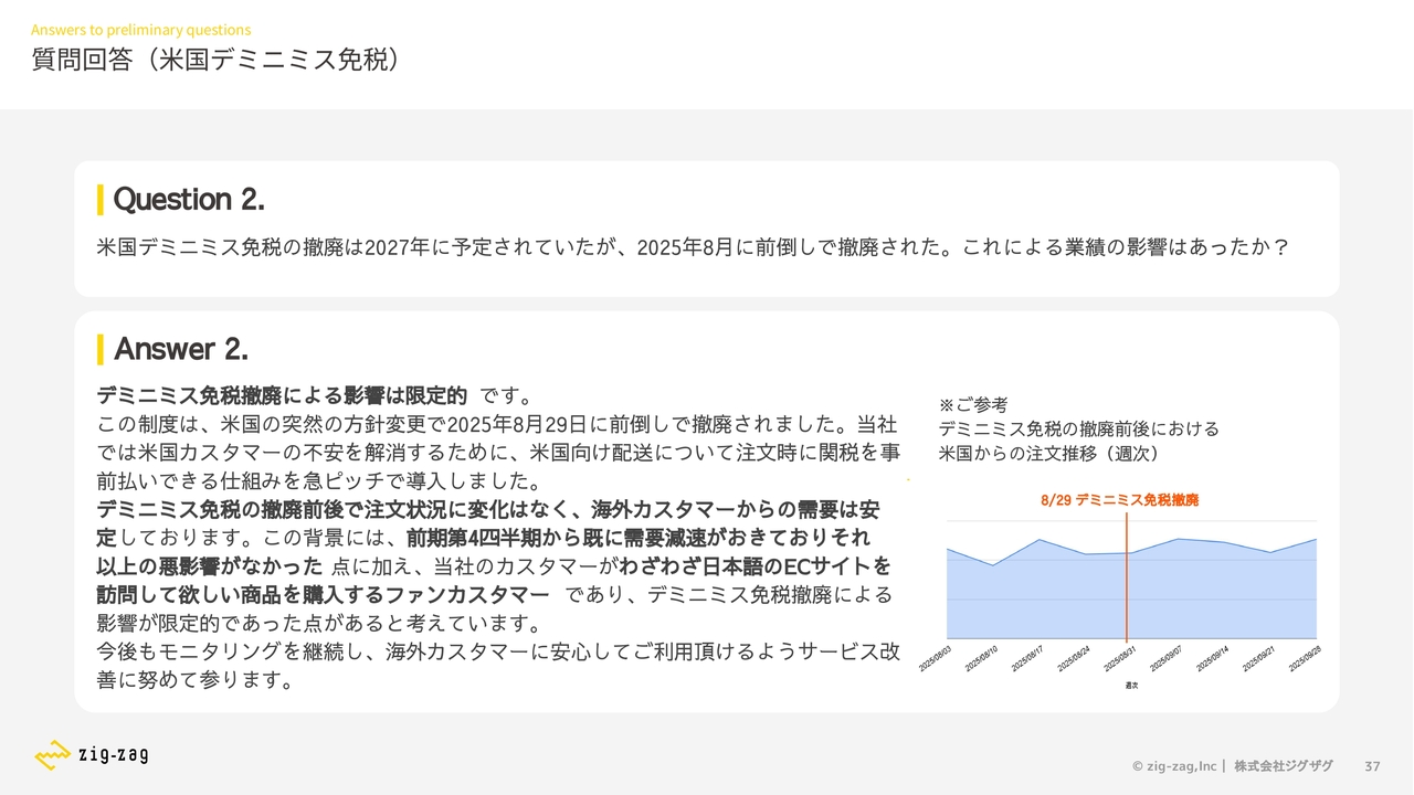 加えて、当社の顧客層は、わざわざ日本語のECサイトを訪れて商品を購入するファンカスタマーであり、デミニミス免税の撤廃による影響は限定的だったと考えています。