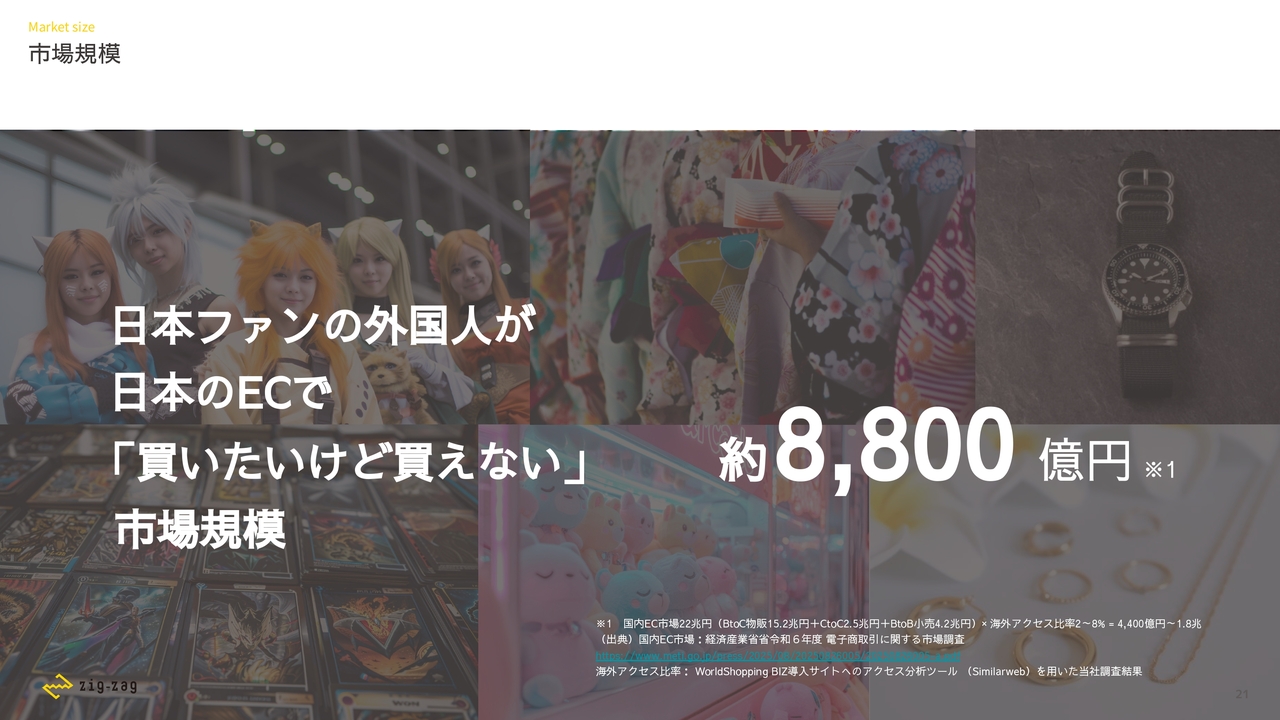 「日本のECサイトで商品を購入したい」という需要があるものの、多くのECサイトが海外販売に対応しておらず、それが購入を阻む要因となっています。この市場規模は約8,800億円と推計されており、毎年拡大を続けています。