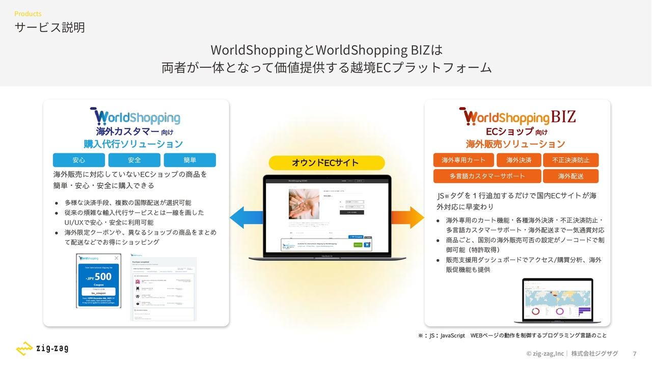 もう1つは「WorldShopping BIZ」です。このサービスはECショップ向けの海外販売ソリューションです。国内ECサイトにタグを1行追加するだけで、国内ECサイトが海外対応に早変わりします。