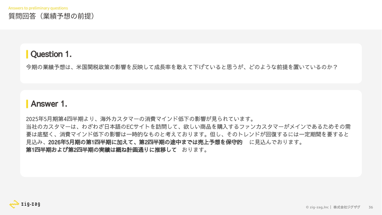 2025年5月期第4四半期以降、海外顧客の消費マインドの低下による影響が見られています。当社のカスタマーは、わざわざ日本語のECショップを訪問して欲しい商品を購入するファンカスタマーがメインであるため、その需要は底堅いと考えています。そのため、消費マインド低下の影響は一時的なものと見込んでいます。