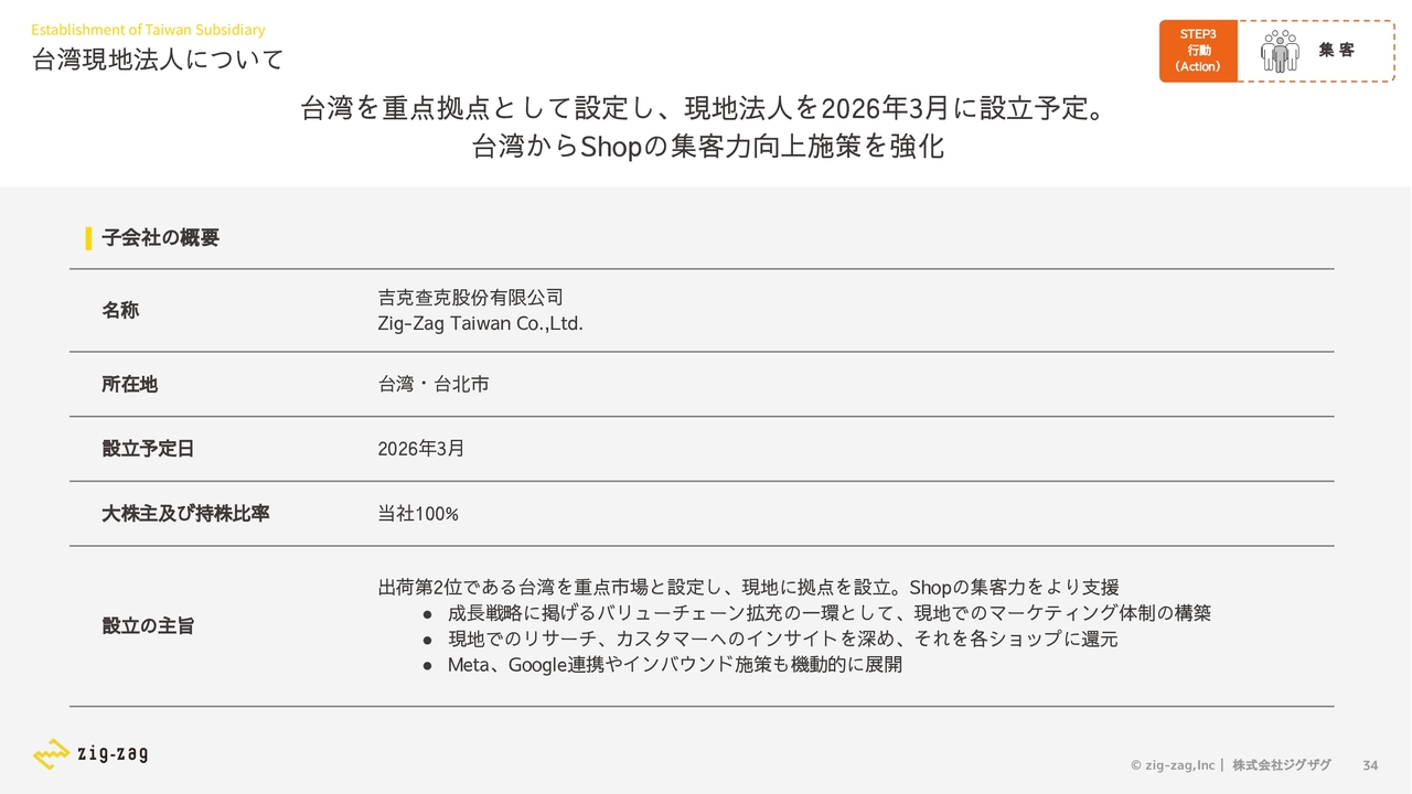 台湾現地法人についてです。成長戦略に掲げるバリューチェーン拡充の一環として、現地でのマーケティング強化および体制構築のため、初となる海外子会社を台湾に設立します。
