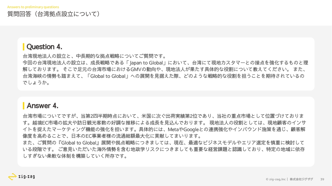 そこで、足元の台湾市場におけるGMVの動向や、現地法人が果たす具体的な役割について教えてください。