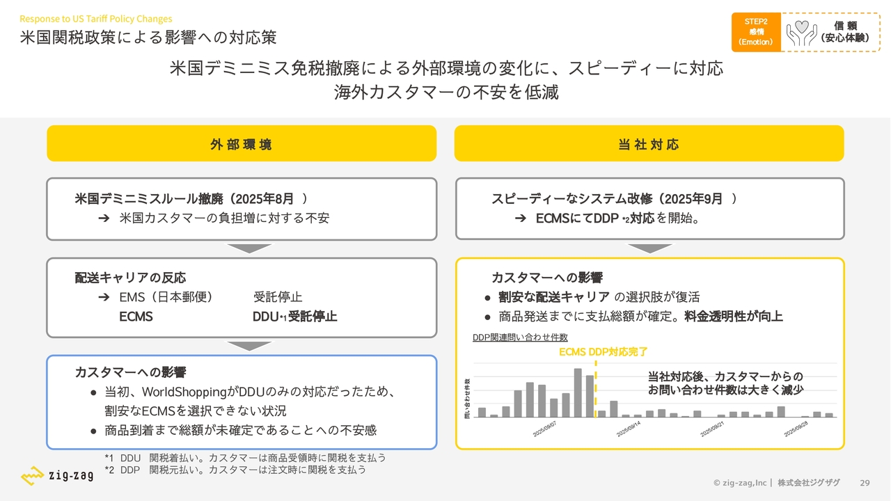 こうした外部環境の変化に対し、当社はシステム改修をスピーディに行い、米国デミニミスルール撤廃の翌月には、ECMSにより、カスタマーが関税を事前に支払うDDPへの対応を開始しました。