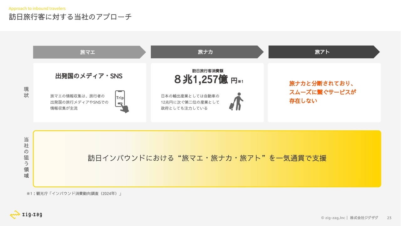 訪日旅行客に対する当社のアプローチについてです。訪日インバウンド市場では、「旅マエ」「旅ナカ」「旅アト」というステージがあります。