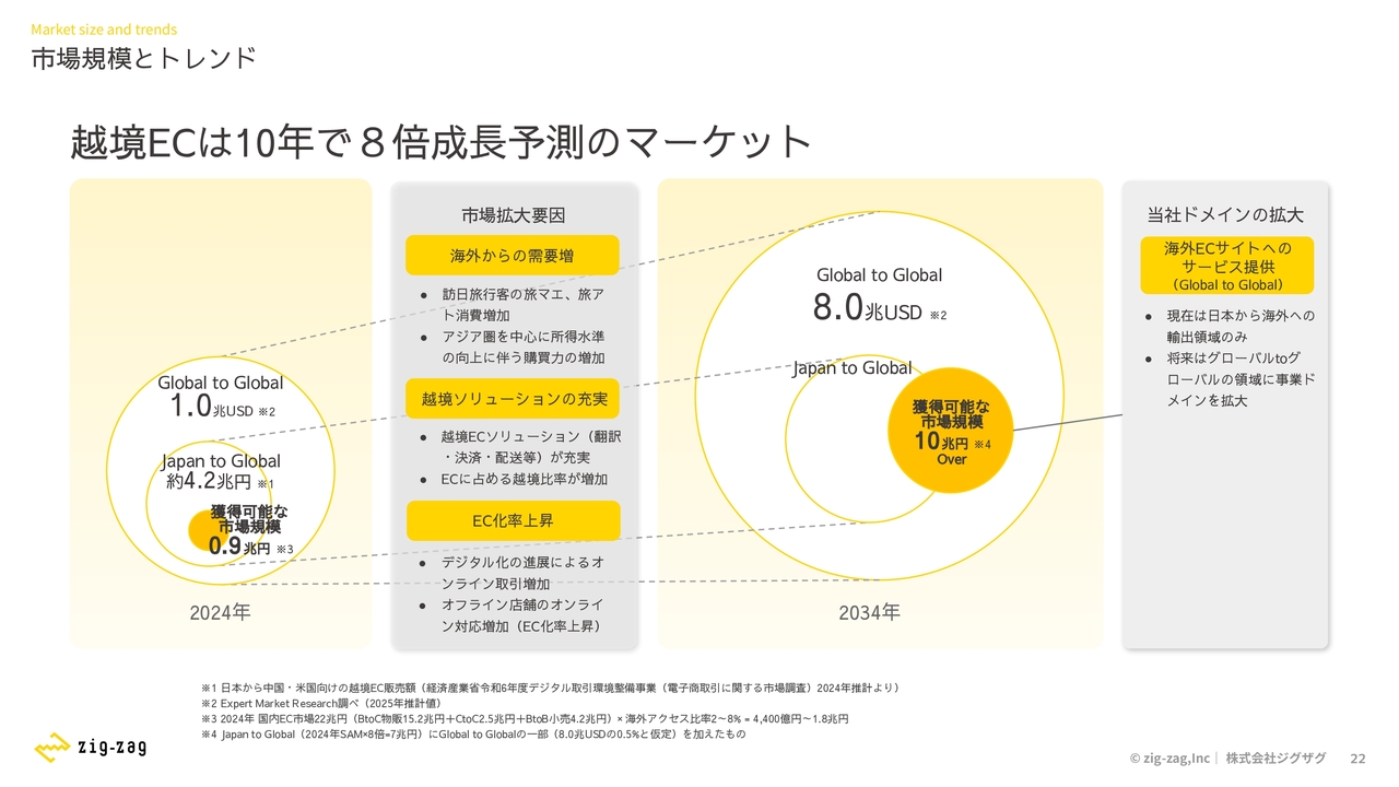 越境ECは、今後10年で8倍の成長が予測されているマーケットです。スライド左側にある「獲得可能な市場規模」の9,000億円が、先ほどの日本のECサイトで購入できない市場です。