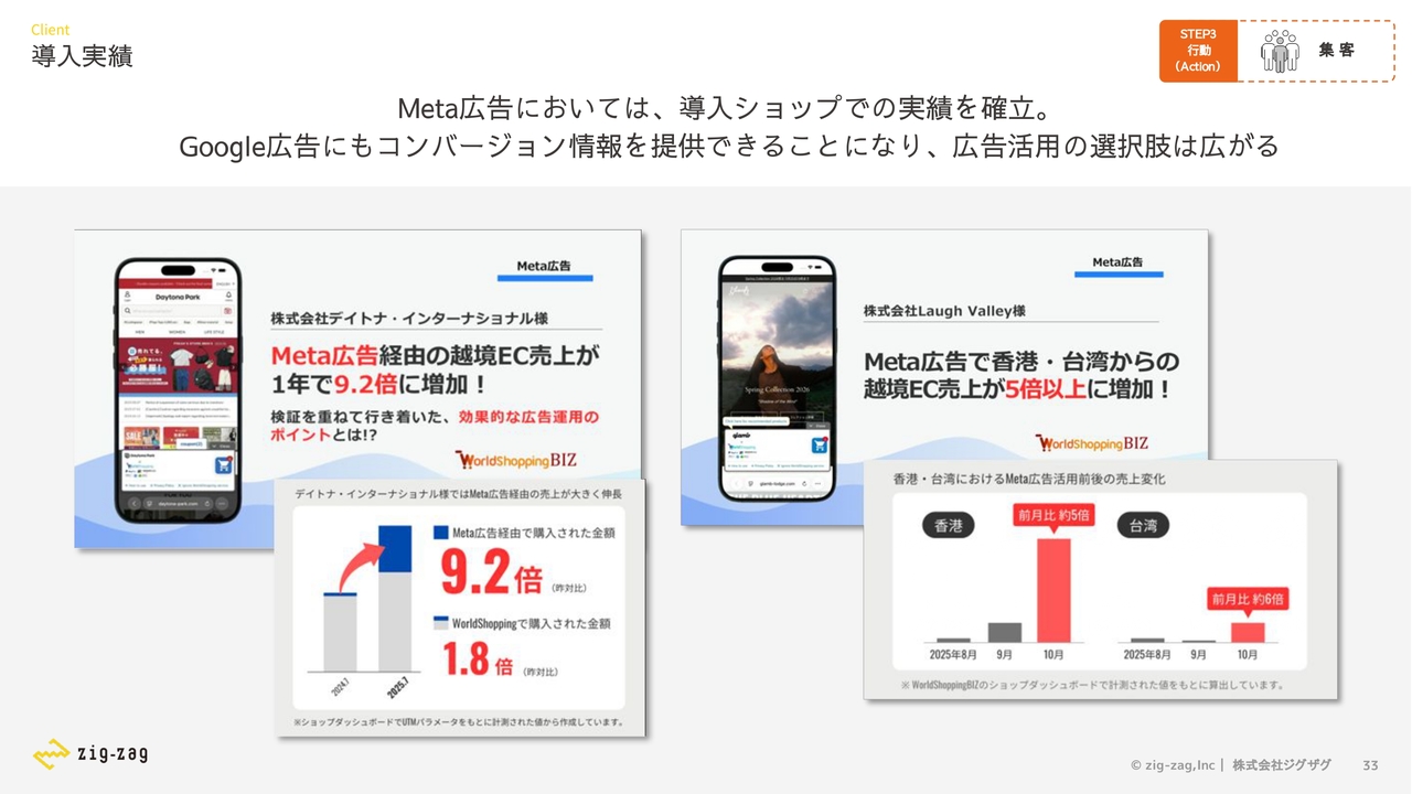 最後にステップ3の「行動」です。ステップ1・2で海外カスタマーへの共感・信頼・熱狂が醸成された状態で、GoogleやMetaとの連携による集客や、信頼を前提とした集客設計によって、リピートや口コミにつながりやすい構造を実現します。