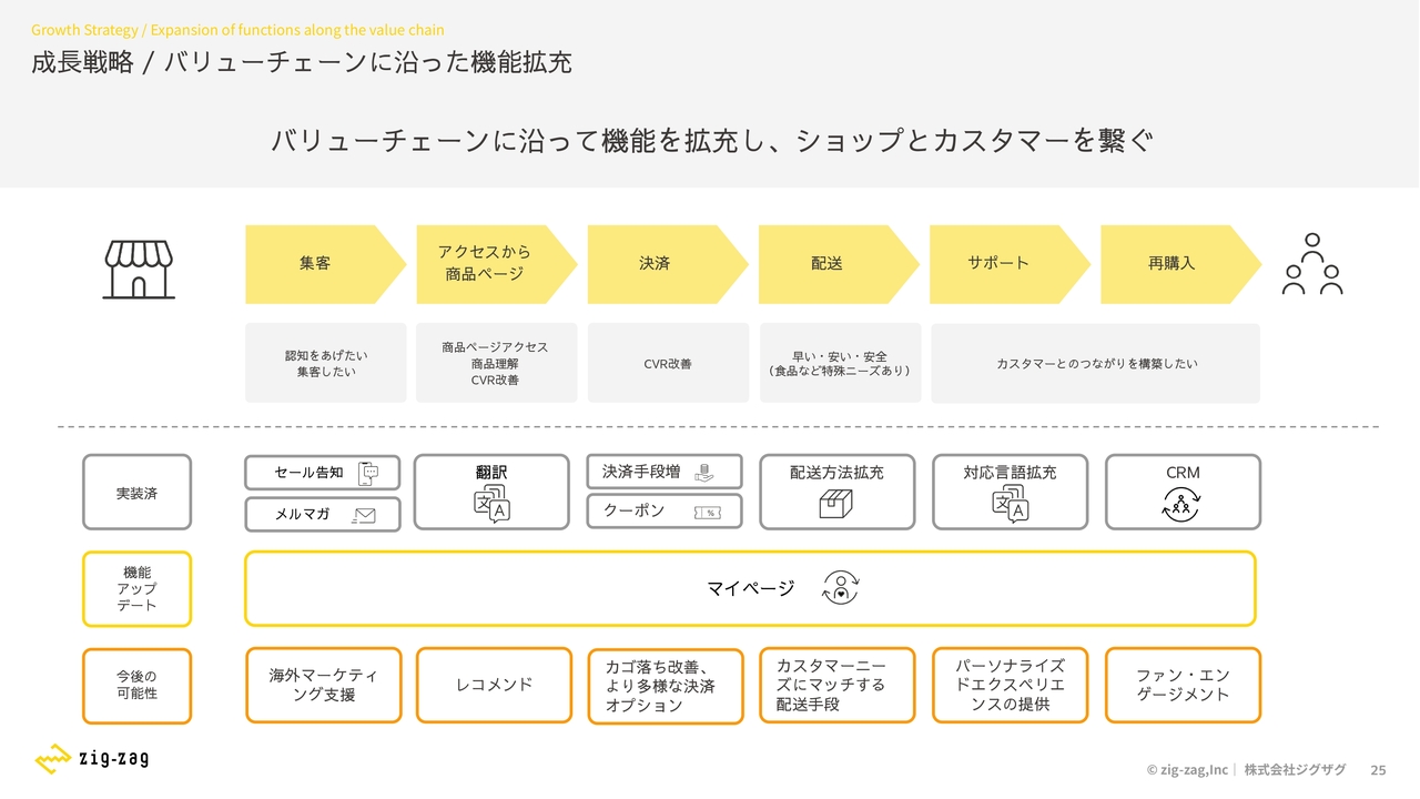 スライドは、機能開発をバリューチェーンに沿って整理したものです。スライド中段にある「マイページ」では基本機能の実装を進め、マイページをハブにして、ショップとカスタマーを気持ちよくつなぐ機能を拡充していきます。
