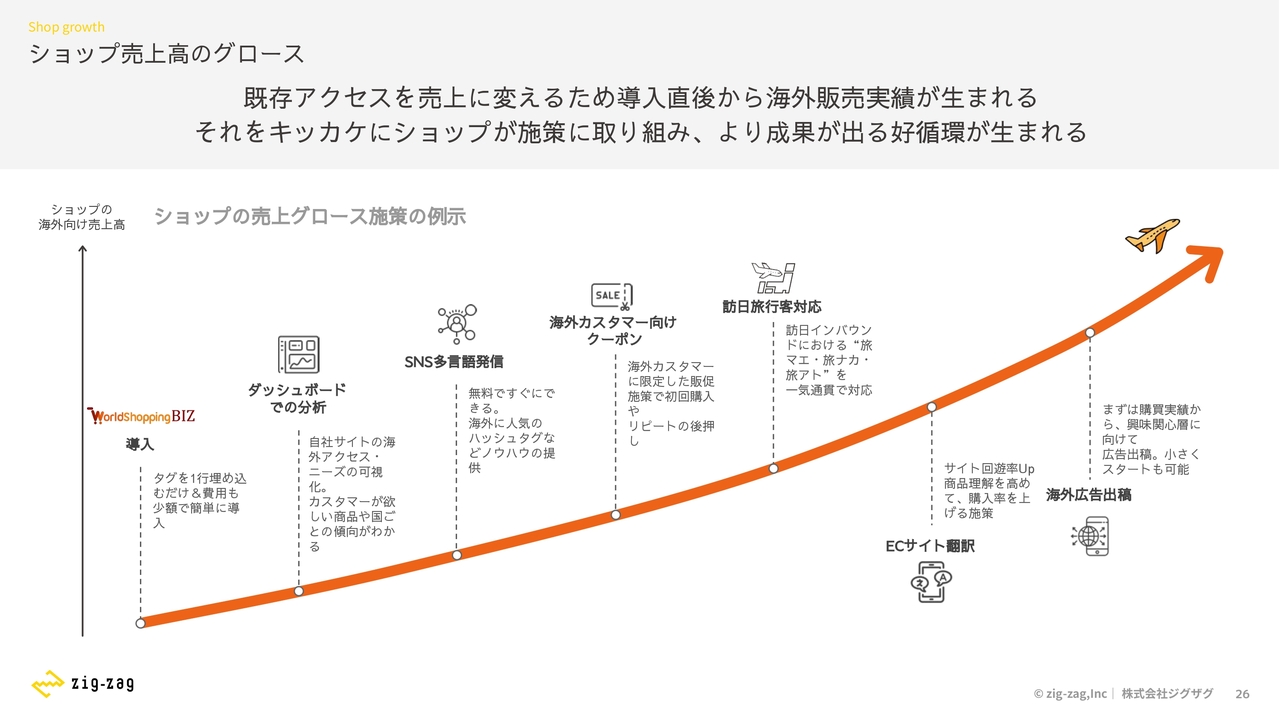 これまでご説明した機能や取り組みは、ショップ売上高の成長施策となります。「WorldShopping BIZ」を利用しているショップの中には、まだ積極的に海外販売に取り組めていないところも存在します。